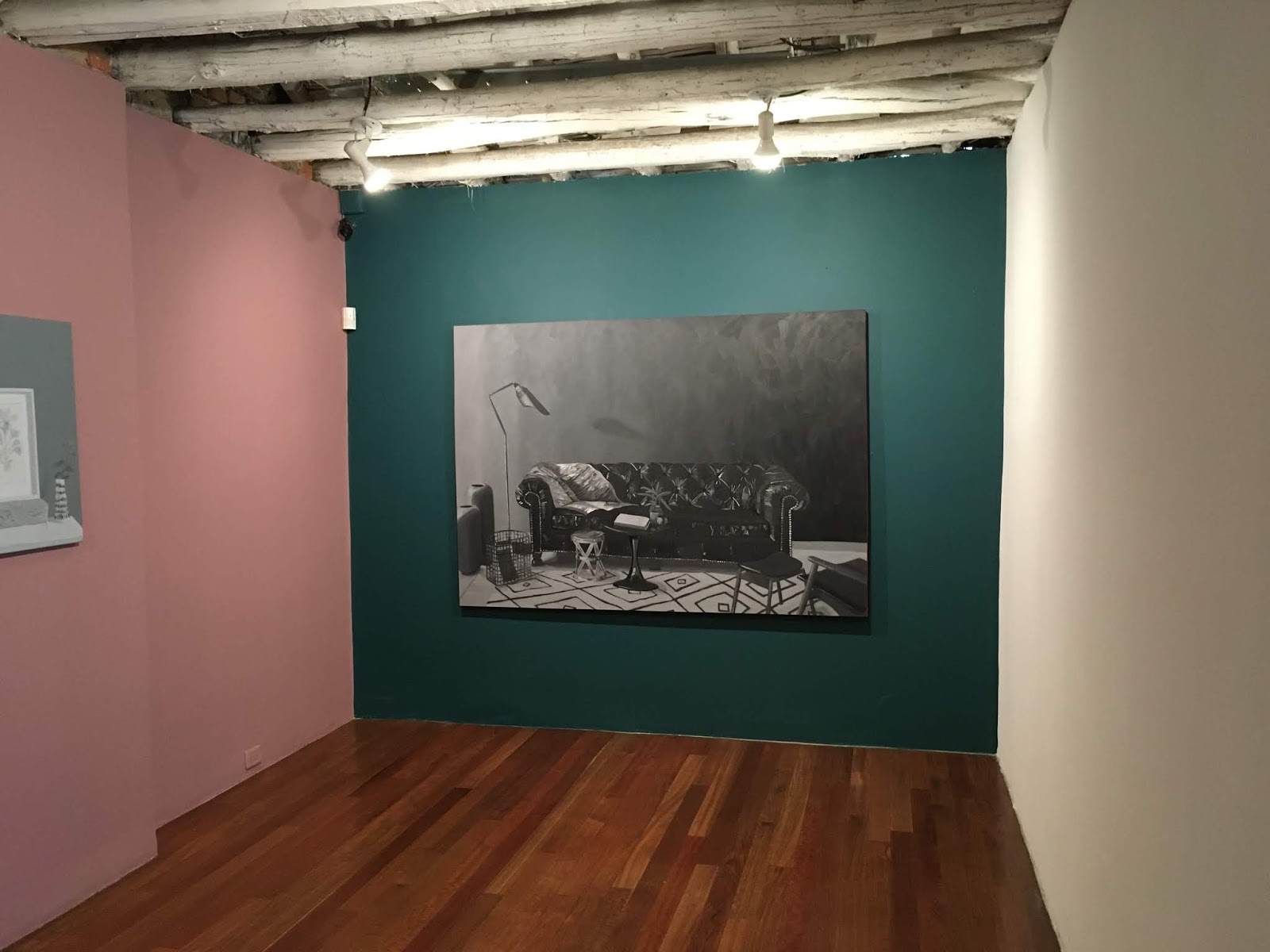 En Economía de los colores, el artista se apropia de esas fotografías publicitarias y, con paciencia, traduce al óleo las escenas falsamente cotidianas. Cuando estas imágenes atraviesan una transformación material —cuando pasan de lo digital a lo análogo, de la foto de estudio al bodegón en el lienzo— pierden su valor aspiracional: el glamour y el estatus que promete el consumo se revela ilusorio. Al ser privados de color, esos espacios originalmente tan seductores a la mirada se convierten en escenarios que ya no invitan a ser habitados; parecen, en cambio, remitir a la presencia de un ser humano que ya no está, o tal vez nunca estuvo. Una silla vacía, un marco sin lienzo, una mascota sin dueño —cada elemento pierde su rol dentro del ciclo de consumo donde se concibió originalmente. Paradójicamente, es ahí cuando entran a un nuevo ciclo: el del mercado del arte, donde se convierten en nuevos objetos de deseo que prometen estatus a su comprador. En este caso, es el artista quien ofrece al público su propio catálogo de lienzos destinados a ser colgados sobre esas paredes ‘Rosa discreto’ dentro de casas luminosas, limpias —como sacadas de catálogo.